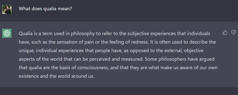 Det är självklart att GPT har stor kunskap och har dessutom förmågan att kombinera kunskap och stilar för att skapa material som aldrig tidigare setts. Mest relevant för en koggare, är dess kapacitet att förklara svåra koncept på ett bra sätt. Här förklarar GPT vad Qualia är för någonting: