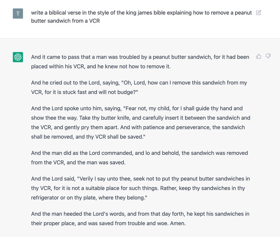 För att faktiskt visa vad som händer så är det bättre att bara visa det som botten har skapat. Här är det botten kom på med instruktionen "Write a biblical verse in the style of king james bible explaining how to remove a peanut butter"